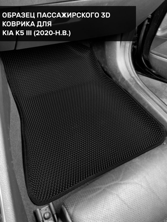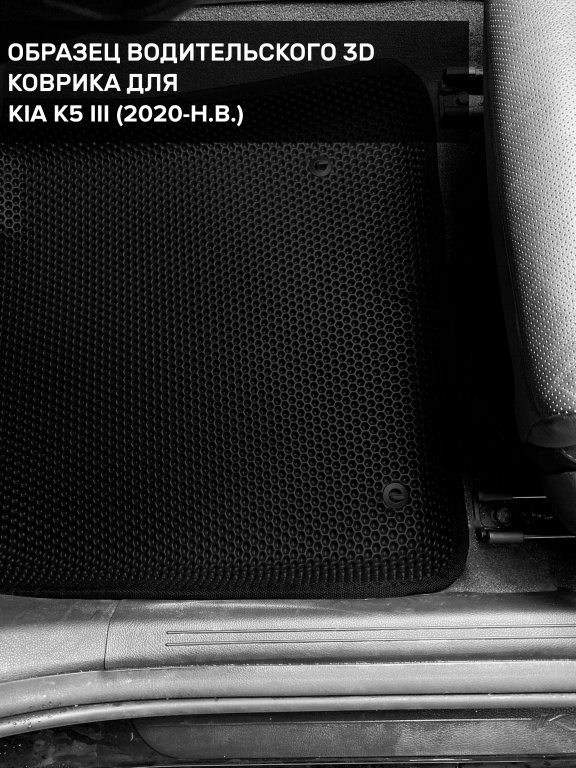 Автомобильные 3д коврики для Kia K5 III (2019-н.в.) в салон авто и багажник сделаны из инновационного полимерного материала EVA, изысканная структура в виде ячеек не дает воде, пыли и снегу разлетаться по салону машины и багажнику. 3д коврики зафиксированы на полу определенными клипсами, соответствующими Kia K5 III (2019-н.в.), и не двигаются в процессе езды.